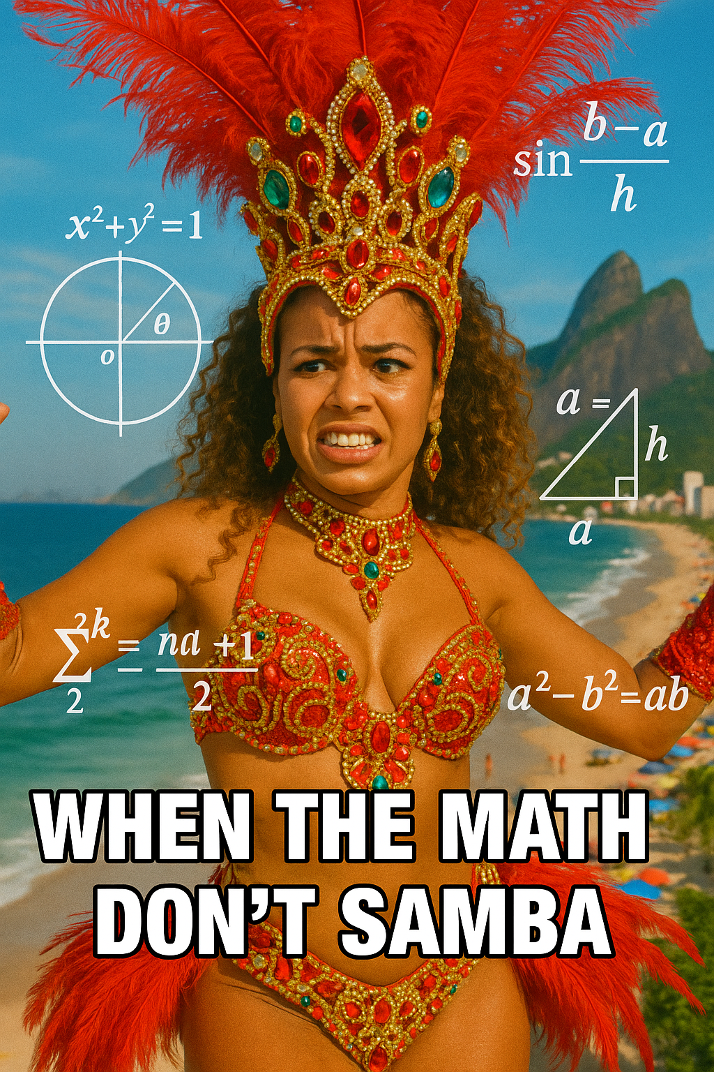Captions such as “WHEN THE MATH DON’T SAMBA” or “WHEN THE MATH DON’T FADO” were added to anchor the images within a meme logic that juxtaposes abstract reasoning with everyday cultural identity. These works were created not only to amuse but to question how we perceive intelligence, confusion, and identity in a globalized, algorithmically mediated visual culture.